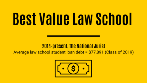 Our commitment to keeping law school affordable has earned Iowa Law a Best Value ranking by the National Jurist since 2014 and a 2024 ranking by U.S. News & World Report as a top law school for paying off debt.